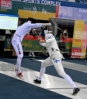 8.4.2022 Akseli Heinämaa miekkaili komeasti 32 parhaan joukkoon U20-poikien kalpamiekkailun MM-kilpailuissa Dubaissa perjantaina.