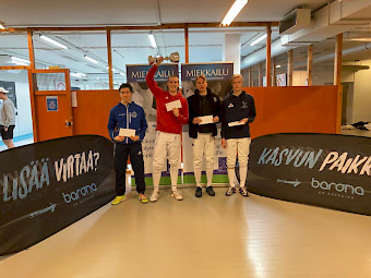 Moa Lundell (MM), Henri Markkula (TMÅF), Outi Jakkola (HABDA) ja Julius Jutila (HABDA) nuorten kalvan SM-kultamistalistit Helsingissä. Sami Vuento (MM) miekkaili kaksi säilän SM-kultaa